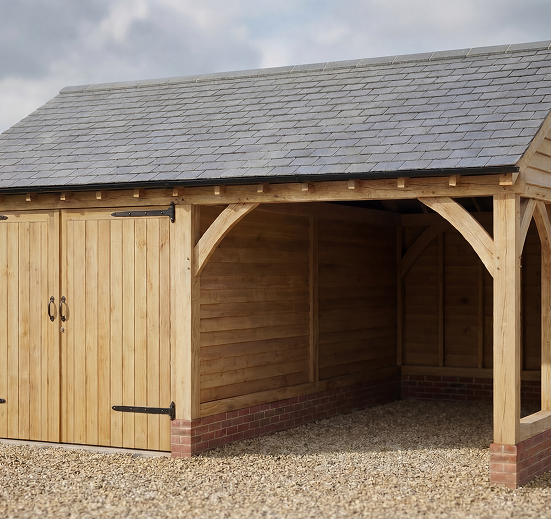 Oak frame timber buildings are a great choice if you want something that looks good, feels solid, and stands the test of time. Made from structural green oak, they blend traditional building methods with modern performance, giving you a garage or garden building that is both practical and full of character.